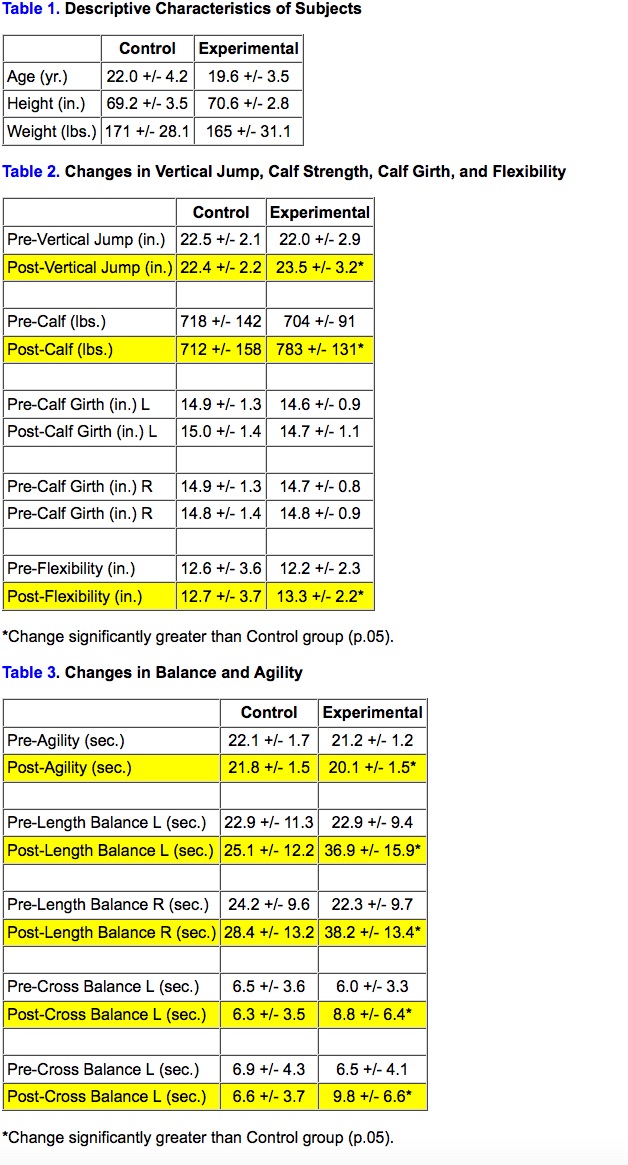 The purpose of this study was to investigate the effectiveness of the Sky King Calf Isolator in increasing calf girth, calf strength, vertical jumping ability, balance, and agility